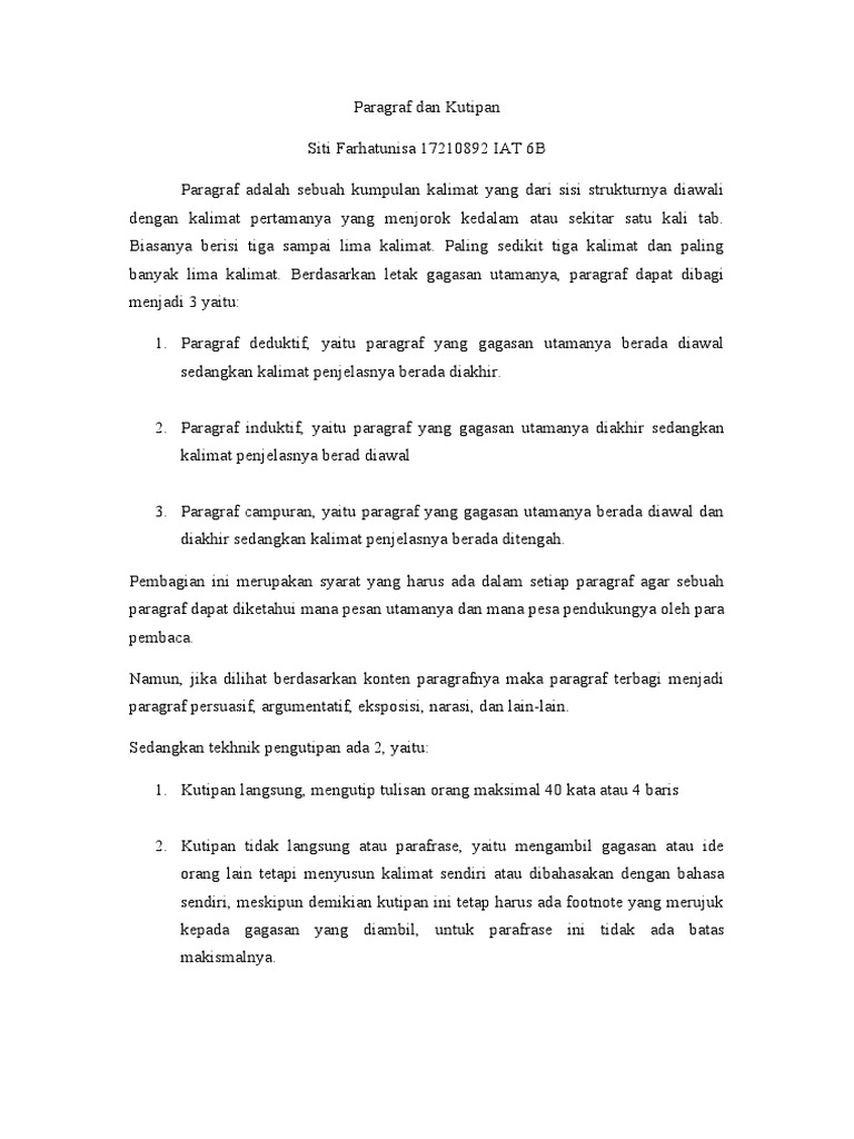 Paragraf adalah suatu rangkaian kalimat yang memiliki suatu gagasan utama. Sedangkan gagasan utama adalah pokok pemikiran utama dari suatu paragraf. Paragraf terdiri dari 3 jenis, yaitu fungsi, gagasan utama, dan isi. Paragraf deduktif paragraf deduktif adalah paragraf yang kalimat utamanya terletak di awal paragaraf dan dilengkapi dengan kalimat penjelas. Paragraf deduktif paragraf deduktif adalah suatu paragraf yang kalimat utamanya terletak di awal paragraf. Kalimat dalam sebuah paragraf memperlihatkan suatu kesatuan pikiran atau memiliki hubungan dalam membentuk sebuah gagasan atau ide pokok tersebut. Berdasarkan letak gagasanannya paragraf dapat dikelompokan sebagai berikut: Gagasan induktif adalah paragraf yang diawali keadaan khusus dan diakhiri dengan pernyataan keadaan umum. Paragraf adalah suatu gagasan yang berbentuk serangkaian kalimat yang saling berkaitan satu sama lain. Nama lain dari paragraf adalah alinea. Untuk menemukan gagasan pokok paragraf seperti ini, kita harus menyimpulkan isinya. Amran tasai, definisi paragraf adalah sebuah seperangkat kalimat yang menjelaskan suatu gagasan atau ide pokok. Paragraf induktif adalah paragraf yang gagasan utamanya terletak di akhir paragraf;