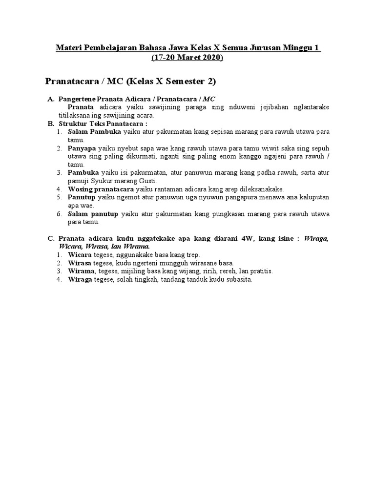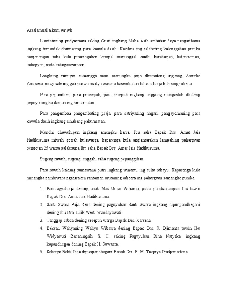 Https Pdfcoffee Com Download Ukbm Pranatacara X Sem 2 Pdf Pdf Free Html from Teks pranatacara bhs jawa tasyakuran. Pranatacara yaiku paraga kang duwe jejibahan/tugas nata lan nglantarake acara/titilaksana ing upacara adat (manten, sripah, lsp) utawa pasamuwan/ pertemuan kang asipat resmi/formal. Struktur penting dalam sebuah teks karena menjadi pola atau kerangka yang memudahkan pembaca memahami tulisan dengan logis. #pranatacara #tingkeban #bahasajawa #jawa #tugas #smksaktigemolong#sragenhits#sragen#jawatengah. Teks pratanacara inggih punika teks dados bebikak setunggaling acara ingkang dipunbektakaken dening setunggaling tiyang kode kategorisasi : Kali ini kita akan membahas mengenai struktur dan kaidah kebahasaan teks cerita. Teks prosedur kompleks memiliki struktur teks yang terbagi menjadi tiga, yaitu: Adicoro pengantin bahasa jawa 1.